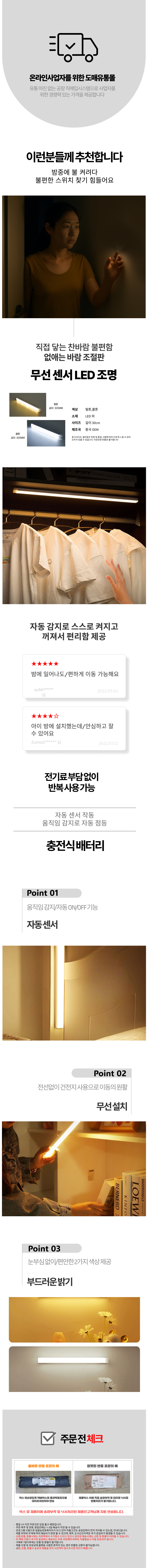 부착식 방수형 LED 센서 전등 옷방 신발장용 조명