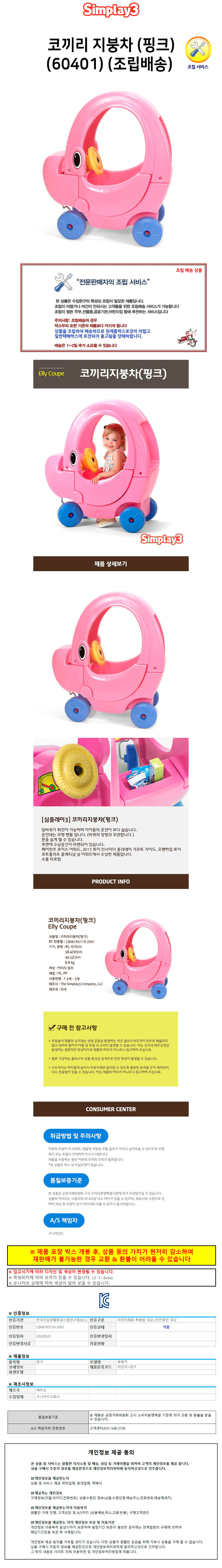 심플레이3 붕붕카 코끼리 지붕차 (핑크) (60401) (조립배송)